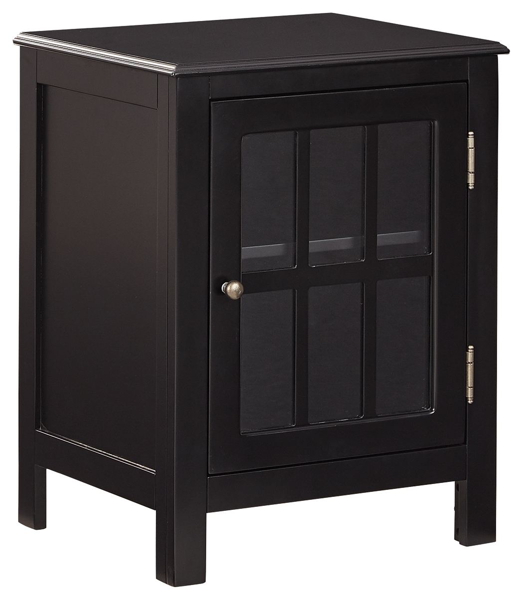 Casual style and function are made easy with this accent cabinet. This versatile storage solution in a black finish is a perfect place to stack bowls, plates and linens. The lattice door front with clear inset glass allows you to show off its contents, allowing for endless decorative possibilities.