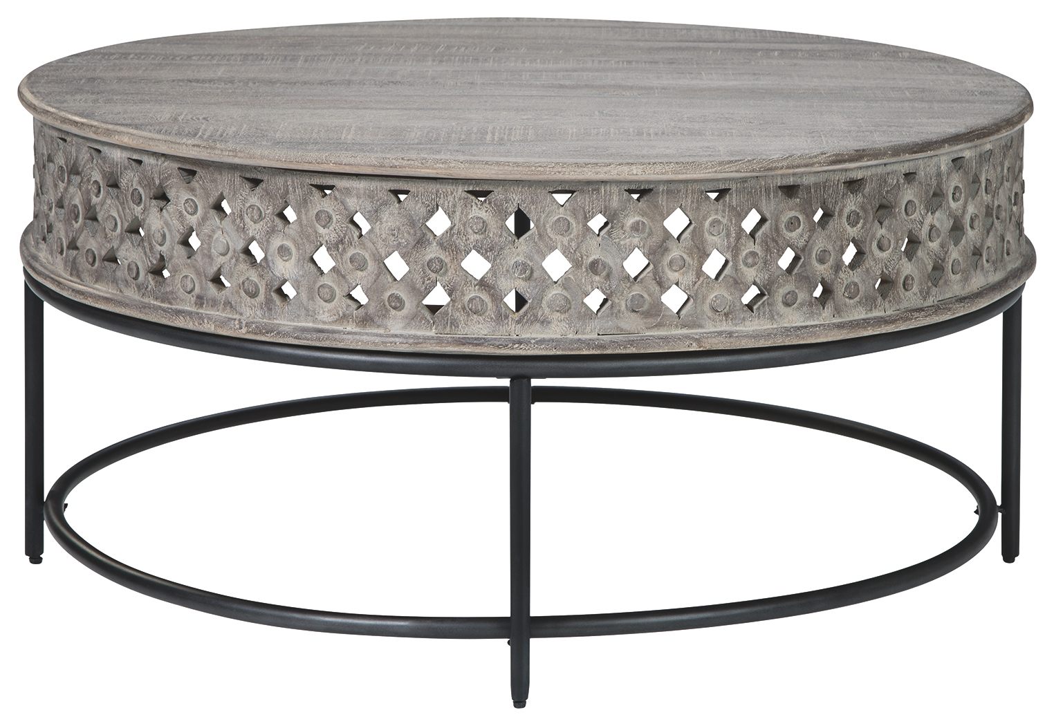 This round coffee table is reserved for those carving out a cool, eclectic aesthetic. Elements of this distinctive table crafted with India mango wood include hand-carved aprons forming an open lattice weave. Metal frame in matte black is a striking complement to the tabletop’s burnished gray finish.