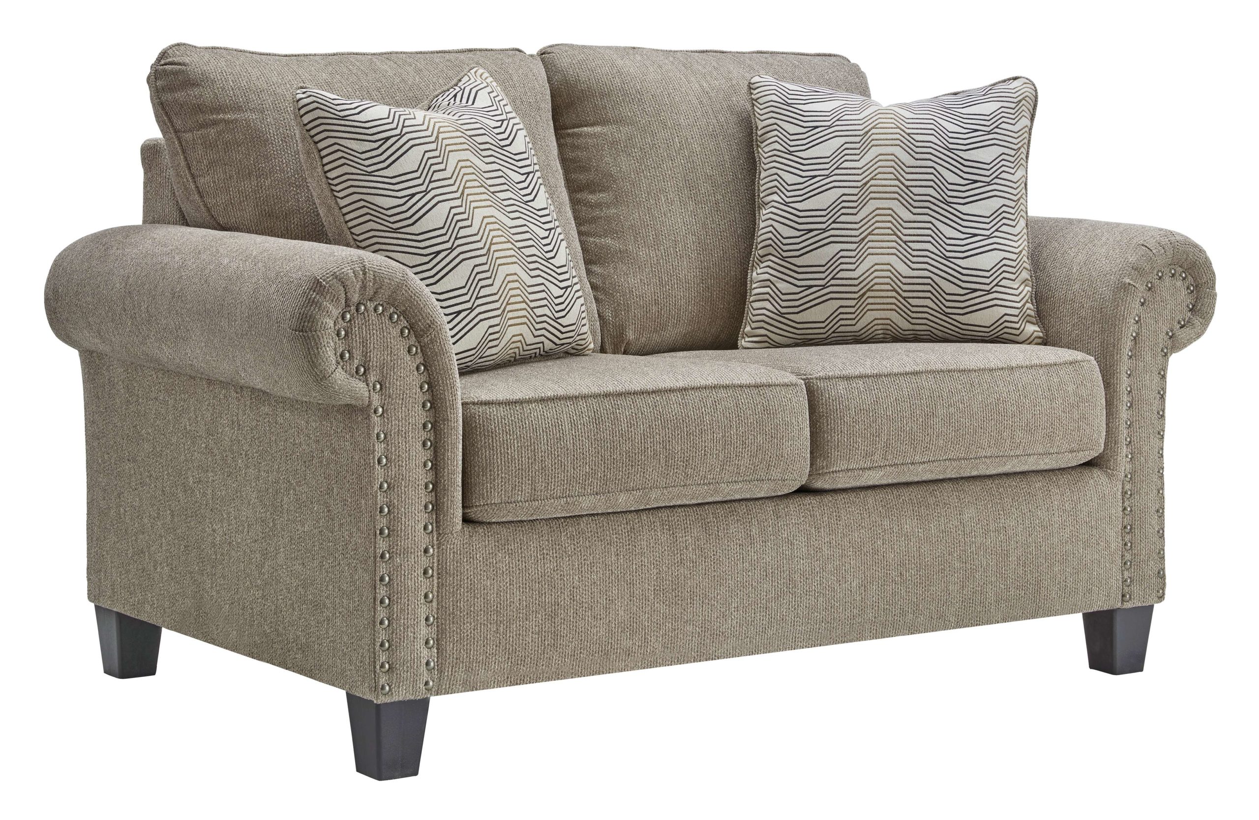 Sporting traditional elements including roll arms with nailhead trim, this loveseat gives here-and-now relevance to a classic style. The lovely pewter shade of the textured chenille upholstery brings a relaxed sensibility. Mix in contrasting tapered legs for a striking look you’re sure to love for years to come.